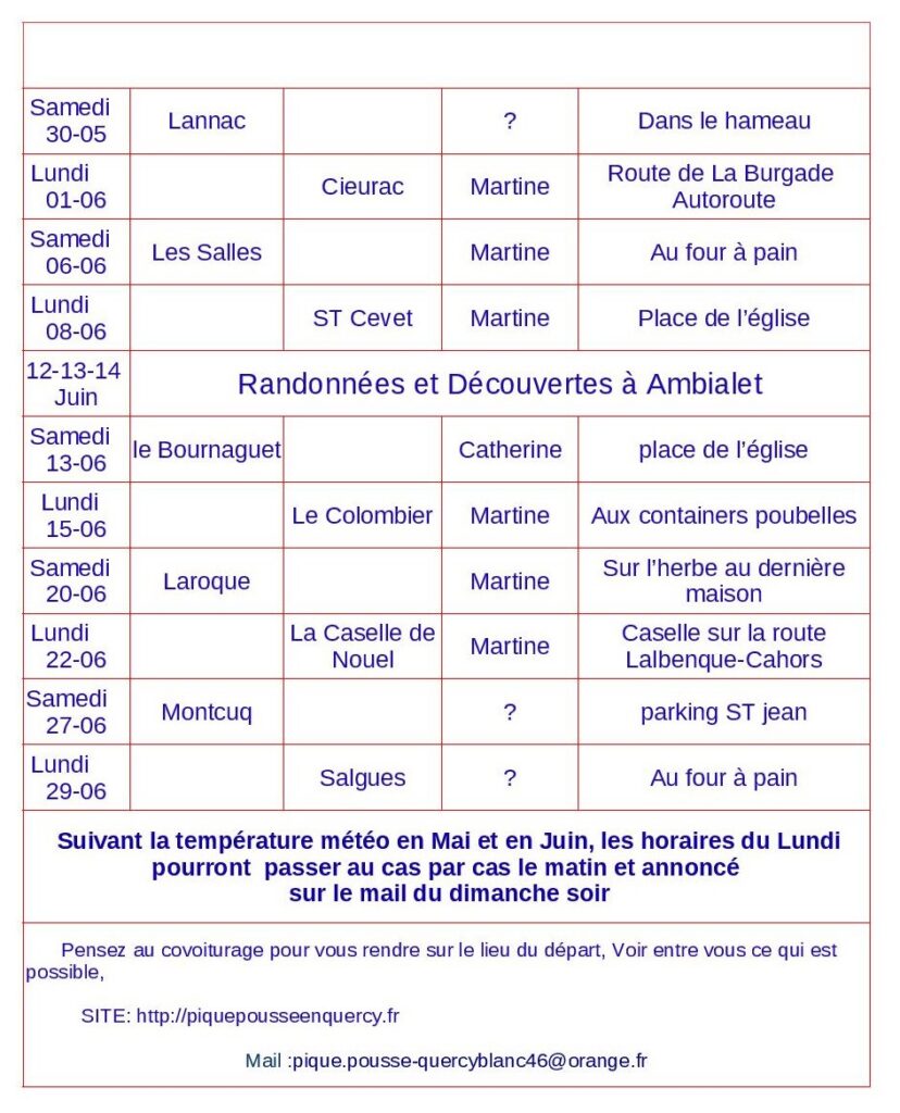 Planning randonnées douce