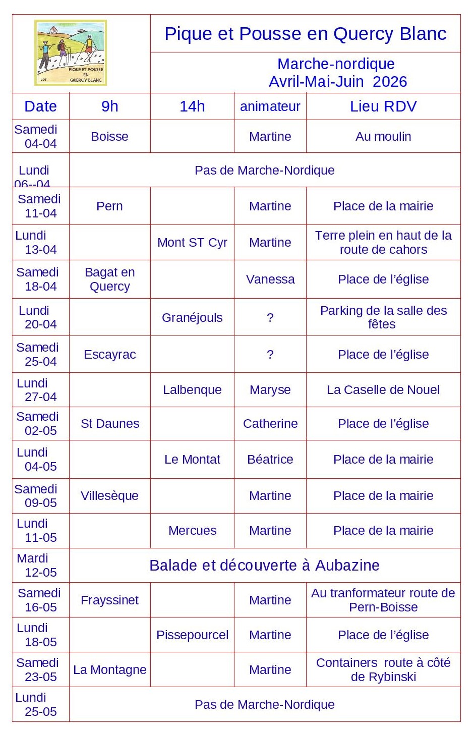 Marche Nordique Avril-mai-juin 2026